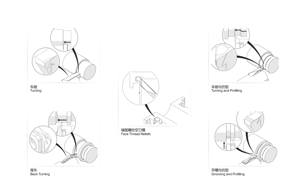 | 背后车削(越过肩部) | 专用槽型(YY 系列) | 宽度 2.0–4.0 mm,圆角 R0.2 | 用于在台阶后方进行车削 |