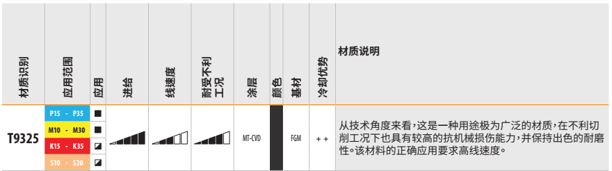 T9325是一种通用性较强的材质,MT-CVD涂层,功能梯度WC-Co碳化物基体 ,在不利切削条件下具有较高的抗机械损伤能力,同时保持良好耐磨性。使用该材质时建议采用较高的线速度。P15 - P35 M10 - M30 K15 - K35 S10 - S20