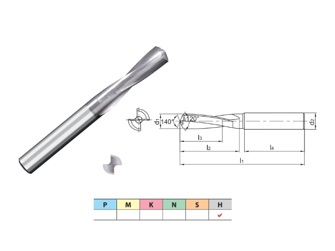 整体硬质合金麻花钻,专门针对高硬度钢(HRC 40~60) 的钻孔加工设计,采用外冷却方式,直柄结构。