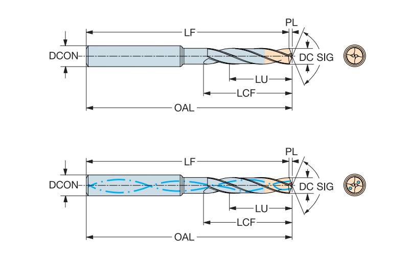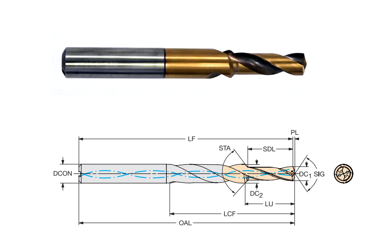 | 直钻型号 | 切削直径DC | 柄径DCON | 有用长度LU | 总长OAL | 功能长度LF | 容屑槽长度LCF | 点长度PL | 外刃顶角SIG |